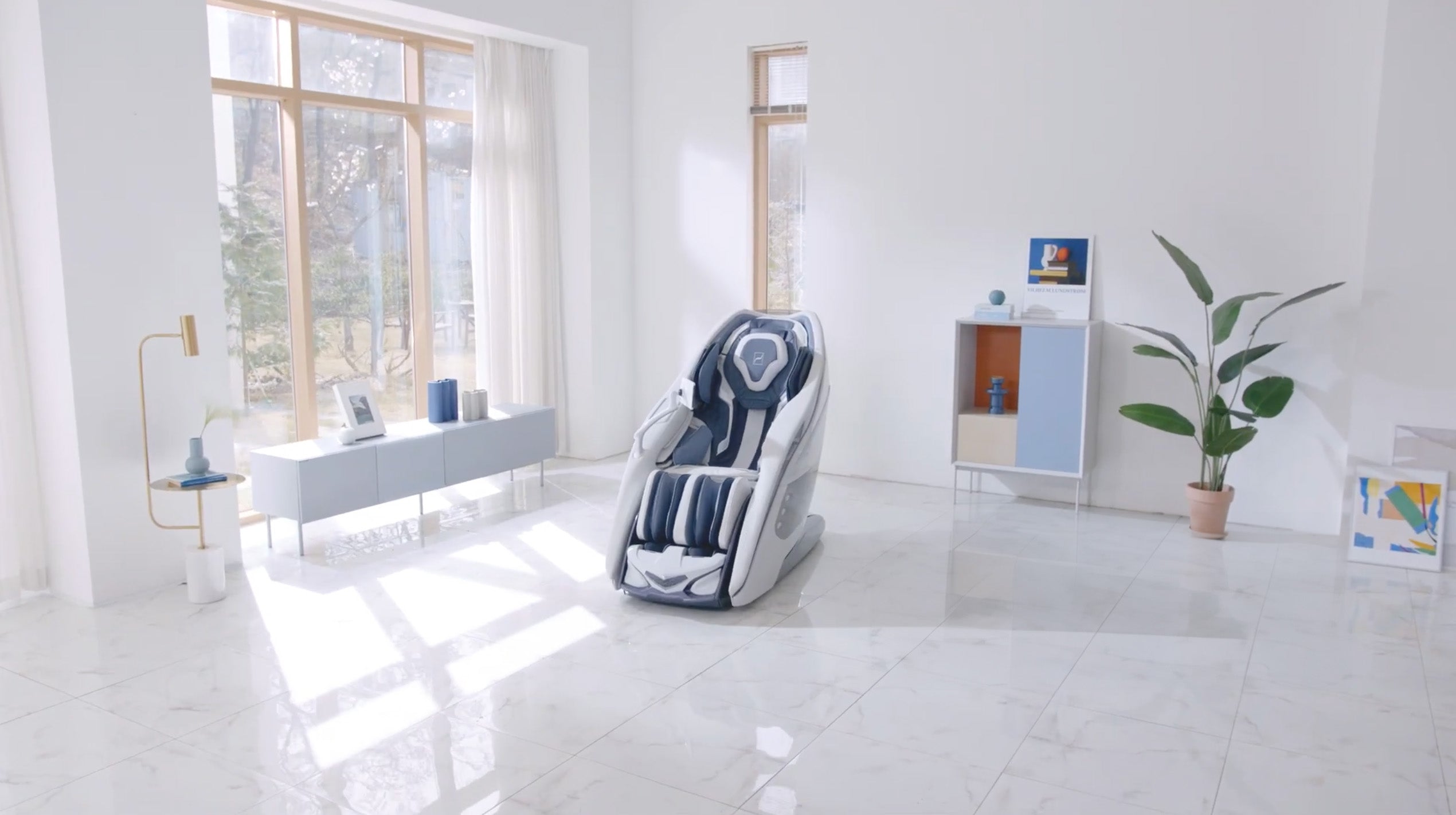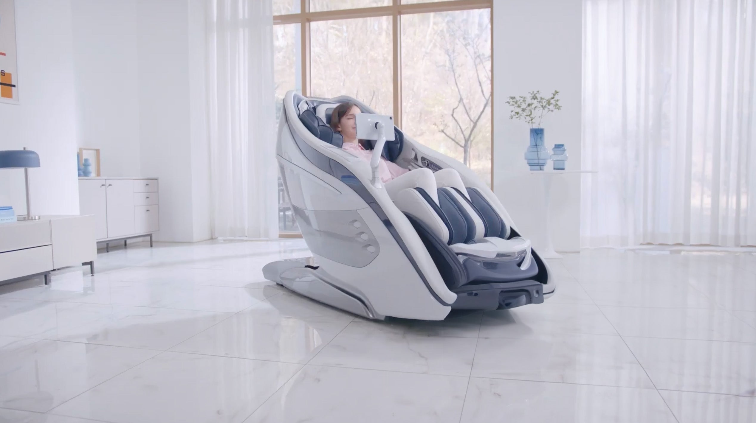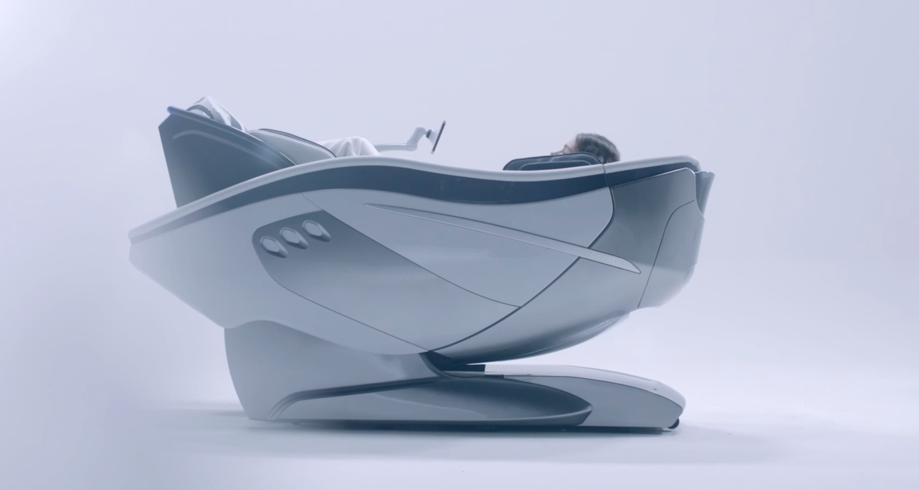 “DaVinci was a challenging project. It led us to express our experience to the fullest in dressing up technologies with consistency and balance. DaVinci is compact, iconic, rational and distinctive and features a clear ‘cocooning’ effect, an enveloping and protective shell with elegant ergonomics, to relax and, above all, benefit from the multiple functions with which DaVinci is equipped. The colour palette used for DaVinci refers to the medical world, with blue, the colour of sanitary and wellness, and white, the ideal colour for the medical and technological sectors. The metallic grey components refer to our many automotive research prototypes. In general, there’s an explicit reference to the automotive world, recognisable in features such as the side light elements that indicate the type of massage activated at the moment or the spin immediately below the footrest”