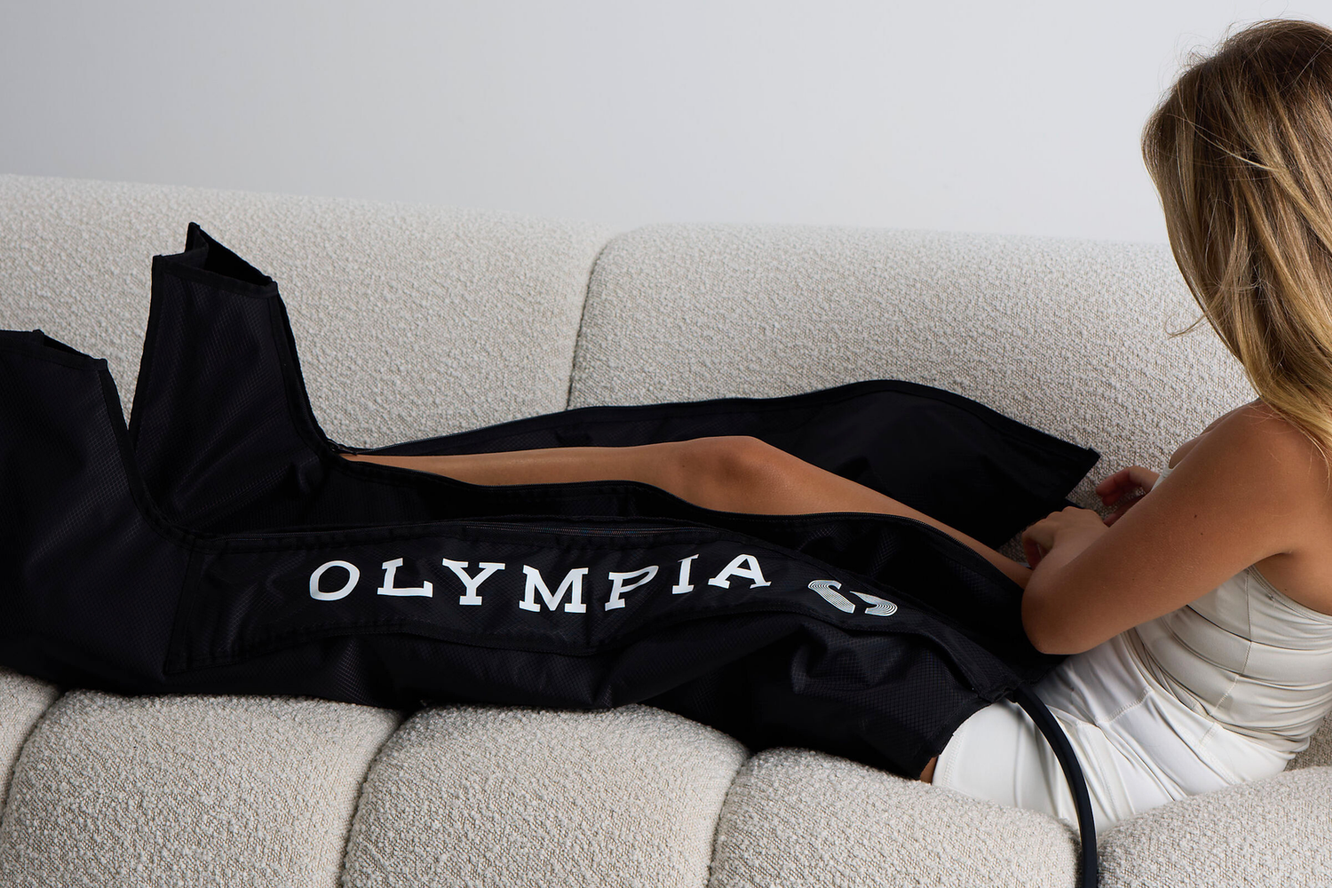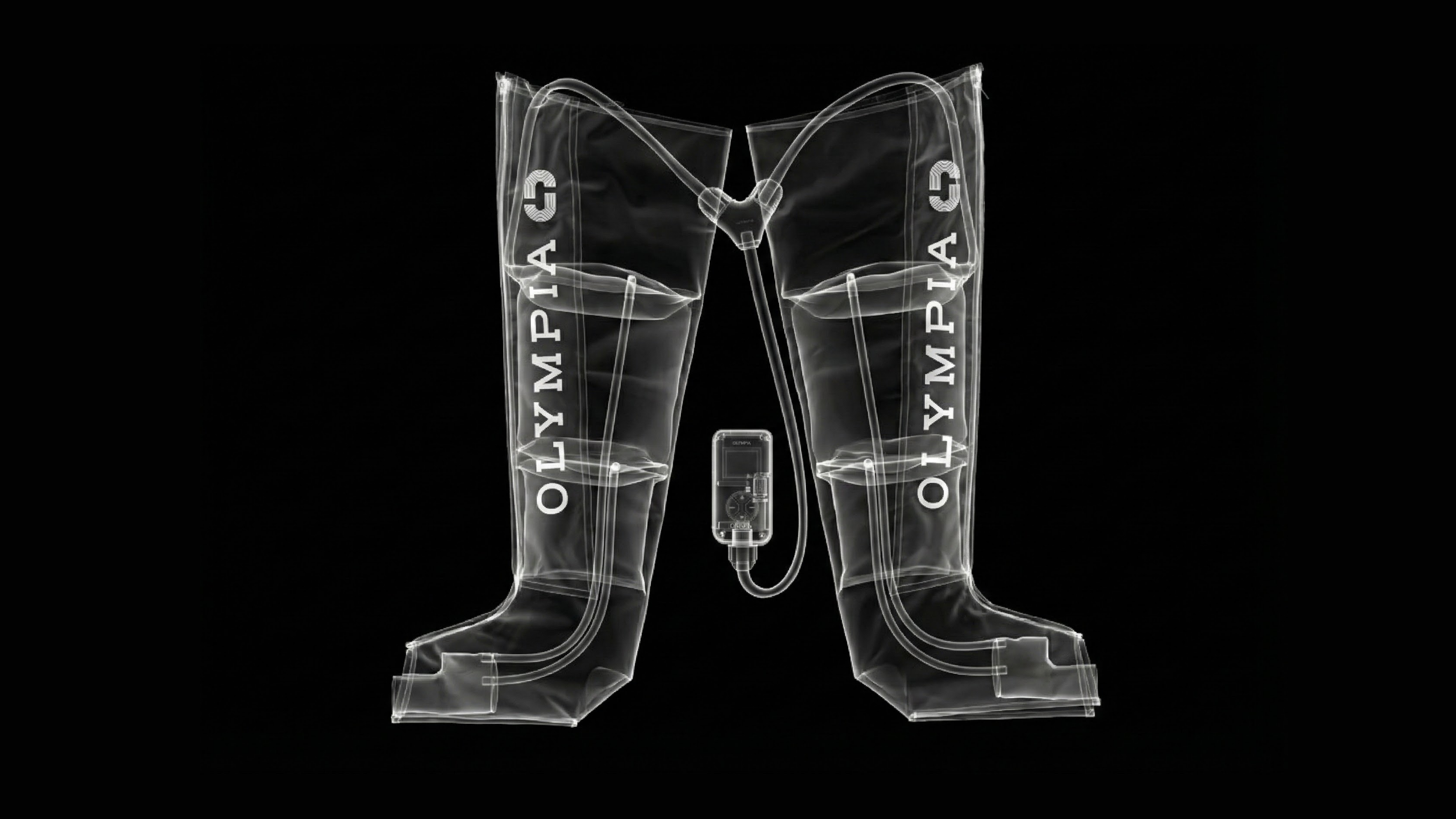 Both boots work together through a central control unit, delivering balanced, evenly timed pressure across both legs for a structured recovery session.